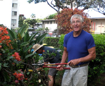 Anyone coming to the LCH campus that day was greeted by the sounds of chainsaws and wood chippers as workers took down the golden shower tree on the corner of Poki and Dominis and the mango tree in the back parking lot. Having been cited by the City for damage to the sidewalk and threatened with fines, the Council had no choice but to have the two trees cut down. Making the best of an unfortunate situation, arrangements were made much of the wood to be put to good use. They are also seeking replacement trees that will not damage the sidewalk. At right, workers use heavy equipment to take down pieces of the mango tree. See additional pictures from the operation in the Parking Lot Tree Removal Slideshow.