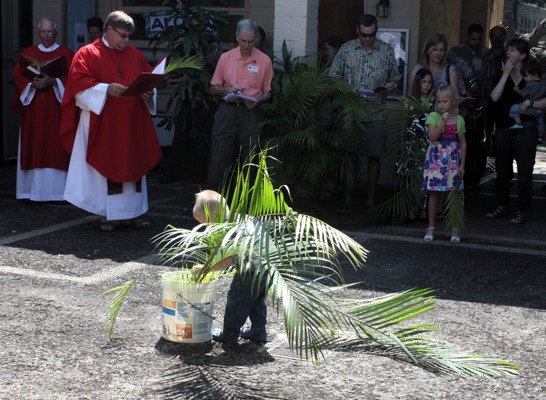 A child selects his own palm as Pastor Jeff prepares to preach on the Gospel story of Jesus’ entry into Jerusalem.