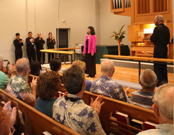 The audience sat in almost total silence throughout, in part because the concert was being recorded, but more importantly because they were entranced by Kathy’s expert performance and Bach’s exquisite compositions. When she had finished the final chorale for the day, the crowd rose to their feet and burst into sustained applause. At left, Kathy stands to receive the applause of the audience (as well as the members of the Bach Chamber Choir) following her encore. A recent post in Kathy’s blog, Another Year of Insanity, recounts audience members’ responses to the concert. Use the arrow on the left to look back at earlier posts, which include information about the encore, refreshments following the concert, the crowd, all the preparations for this performance, and much more. Tickets for the second concert, August 25 at 2:00 PM, are available on the AGO-Hawai‘i website. LCH Volunteers Feed a Huge Crowd at IHS