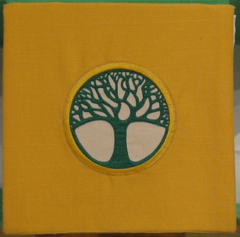 The green chalice veil is decorated with the Tree of Life, again ringed with a yellow circle.